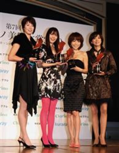 美しい脚の著名人に贈られる第7回「クラリーノ美脚大賞」に20代部門で長澤まさみ、30代部門で釈由美子、40歳以上の部門で真琴つばさ、スポーツ部門でビーチバレーの浦田聖子選手が選ばれ、東京都内で授賞式が行われた。 カラータイツにミニスカート姿…